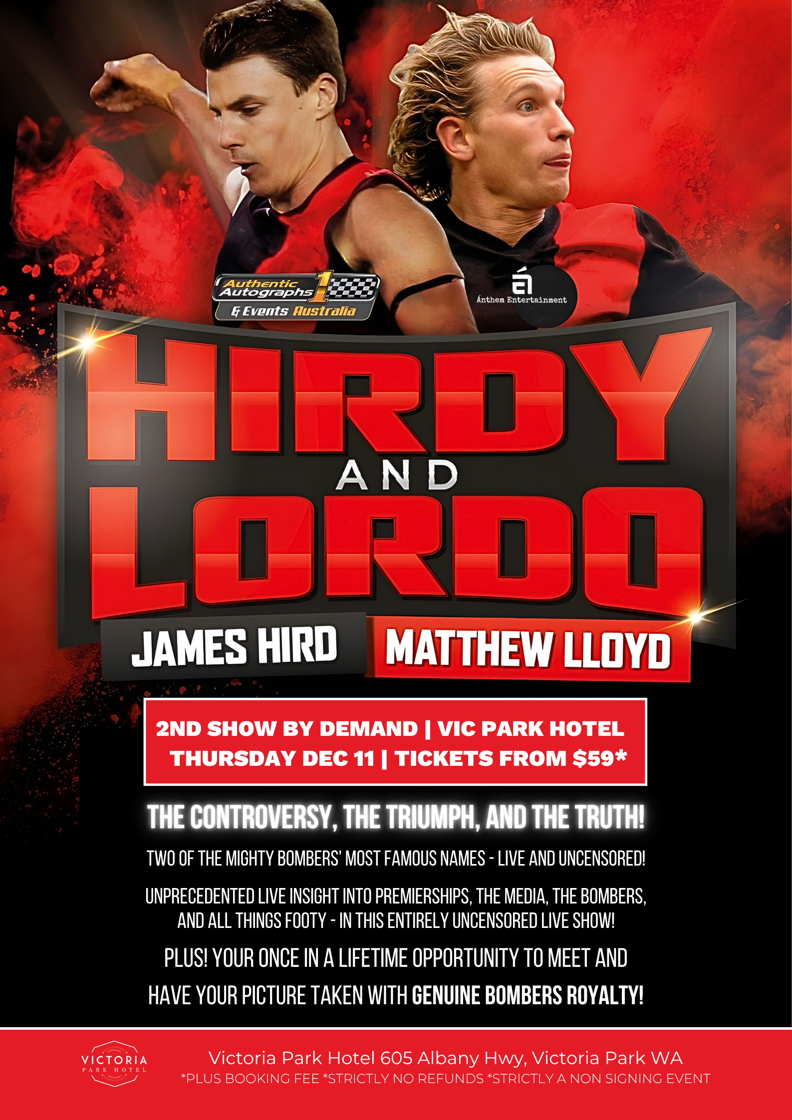 Pre-Show VIP Experience $295* - Includes a pre-show meet n greet with James & Matt, entry to the show, front row seats & your pic with these 2 Essendon FC legends! Please note, arrive at 6pm for this experience & strictly non signing.