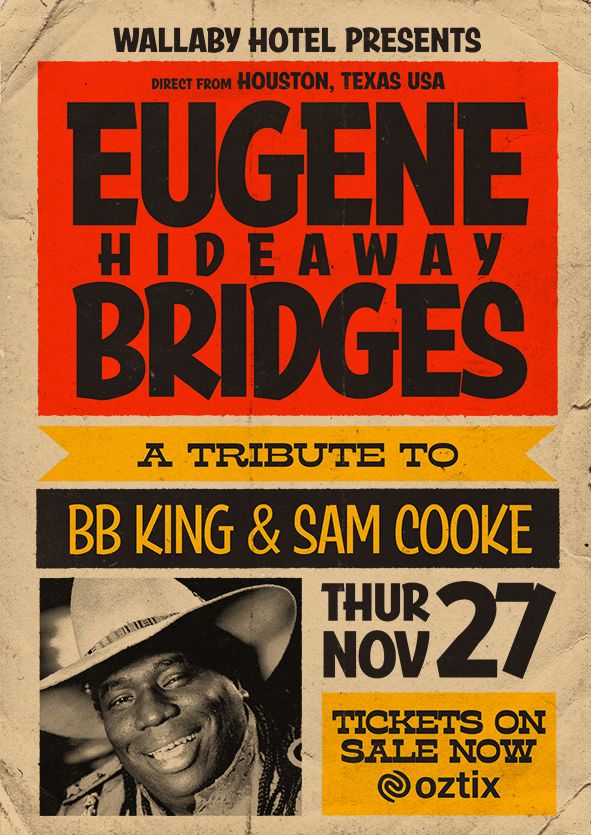When Eugene 'Hideaway' Bridges opened for B.B. King at the State Theatre in Sydney some years ago, his version of Sam Cooke's 'A Change Is Gonna Come' was a showstopper. Now in 2025 Eugene is back in Australia to present a show that features a tribute to both B.B. King and Sam Cooke as well as a collection of his own best known songs. The opening set is all Eugene and his band, followed by a 90 minute second set that features the classic B.B. and Sam Cooke songs. With both a great blues and incredible soul voice, not to mention some great guitar artistry, Eugene is equally at home paying tribute to both these artists in show that's steeped in music history.