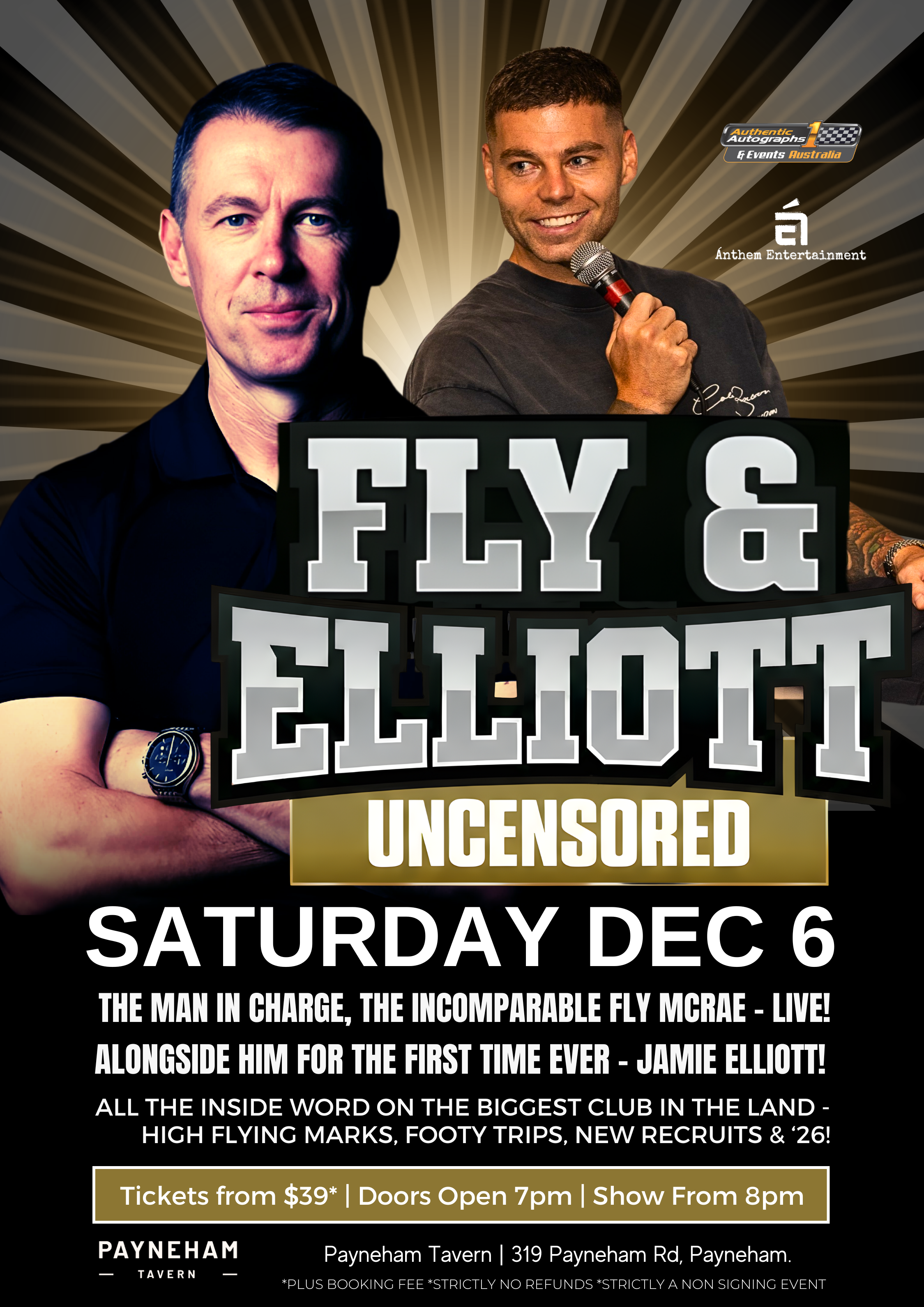 Pies Fans you're invited to see FLY & ELLIOTT LIVE & UNCENSORED for one exclusive show only - Saturday December 6 at Payneham Tavern!