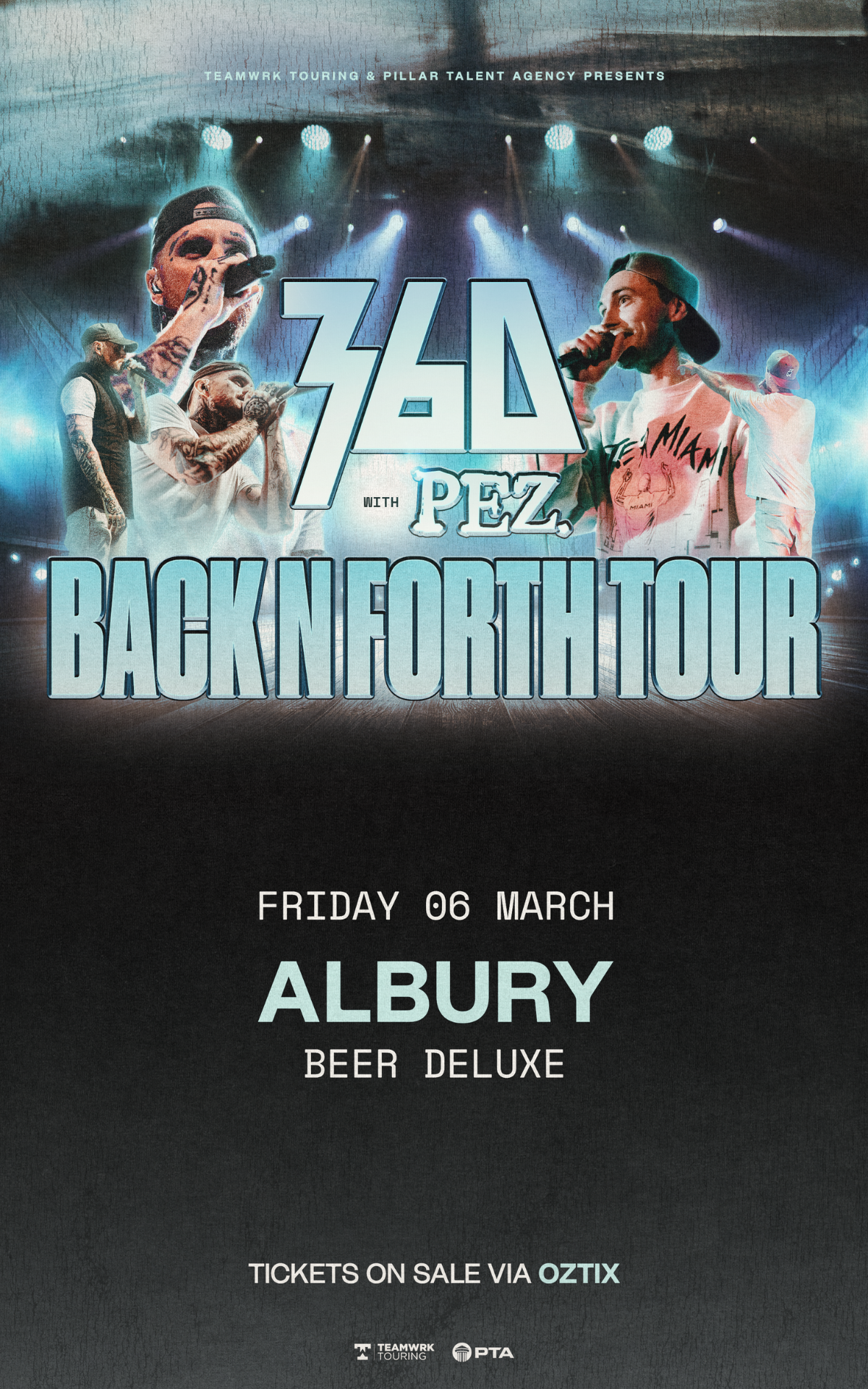 Following the sold-out Out Of The Blue capital city tour, ARIA Award-winning rapper 360 is hitting the road again, this time, taking it BACK N FORTH across regional Australia with special guest PEZ.