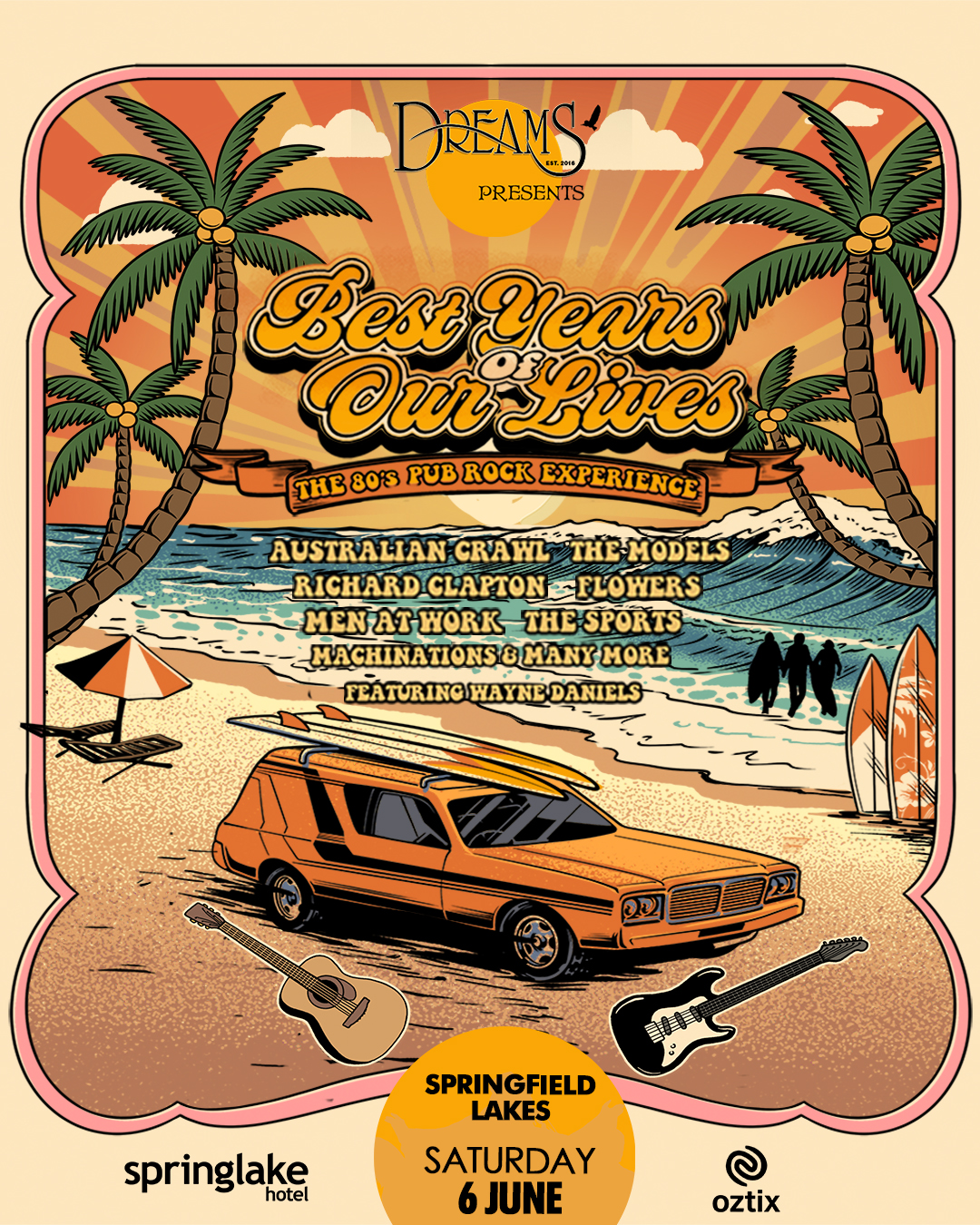 Presented by Dreams, “Best Years of Our Lives” features Wayne Daniels, the lead guitarist and vocalist of Dreams, who played a pivotal role during this era through his original bands, Triple Entente, Shikira, and Colour Blue. Wayne’s deep connection to the music of this time brings an authentic voice to the tribute, allowing audiences to feel the spirit of pub rock as it was meant to be experienced.